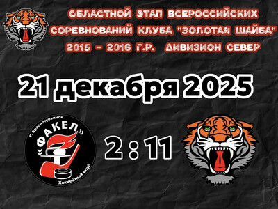 21 декабря 2025 года в городе Краснотурьинск состоялся первый матч у команды МБУ ДО ДЮСШ "Металлург" 2015-2016 г.р. тренер-преподаватель Пантелеев Дмитрий Вадимович с командой "Факел" в рамках Областного этапа Всероссийских соревнований клуба «Золотая шайба». | |