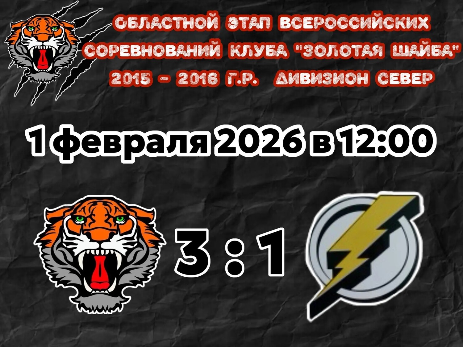 01 февраля 2026 года состоялся календарный матч Областного этапа Всероссийских соревнований клуба «Золотая шайба». Команда МБУ ДО ДЮСШ "Металлург" 2015-2016 г.р., тренер-преподаватель Пантелеев Дмитрий Вадимович. Команда "Металлург" на своём льду принимала команду "Молния" г. Верхняя Тура.
