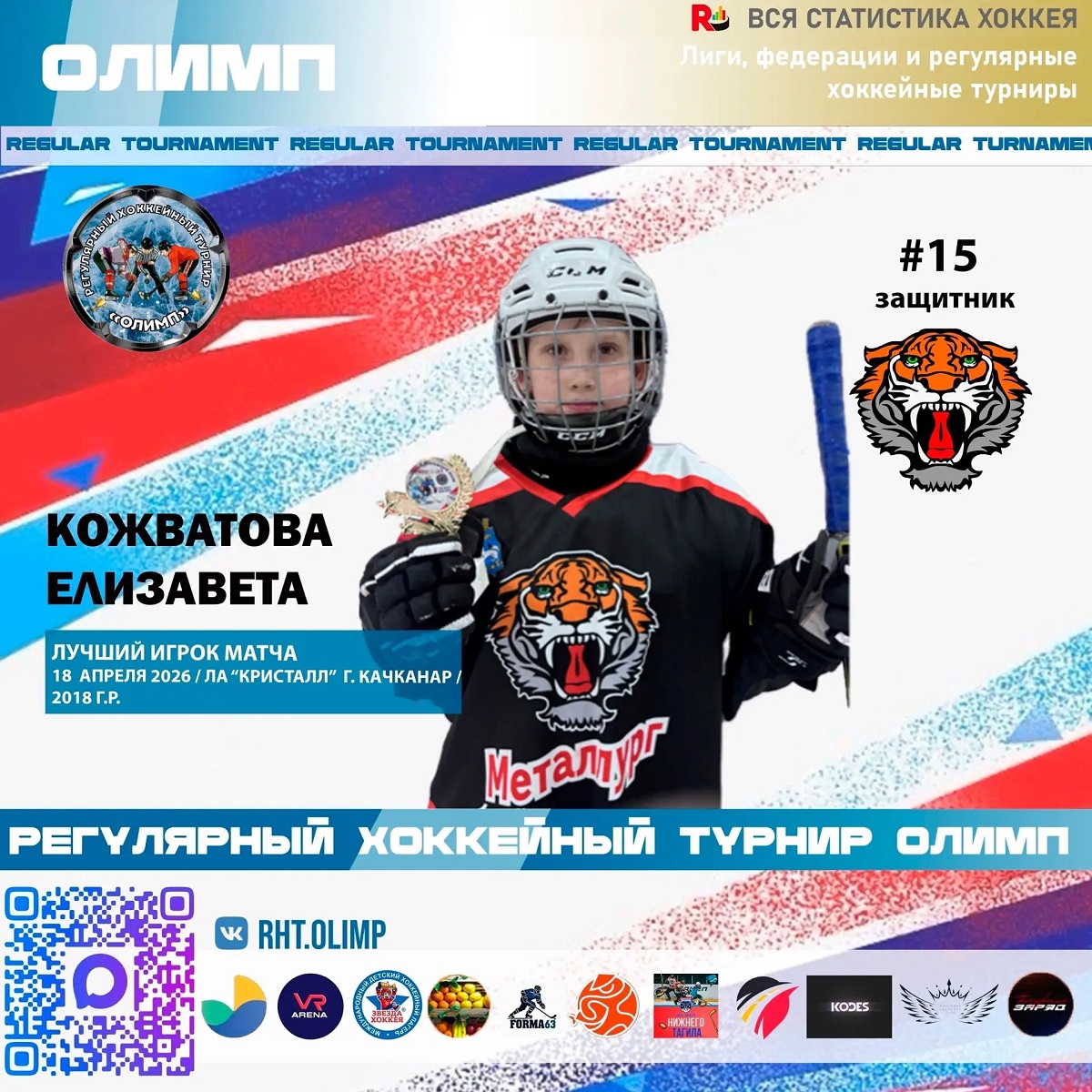 18 апреля 2026г. в городе Качканар состоялся регулярный хоккейный турнир "Олимп" среди команд 2018г.р., в турнире приняла участие хоккейная команда МБУ ДО ДЮСШ "Металлург" тренер-преподаватель Пензин Алексей Александрович.